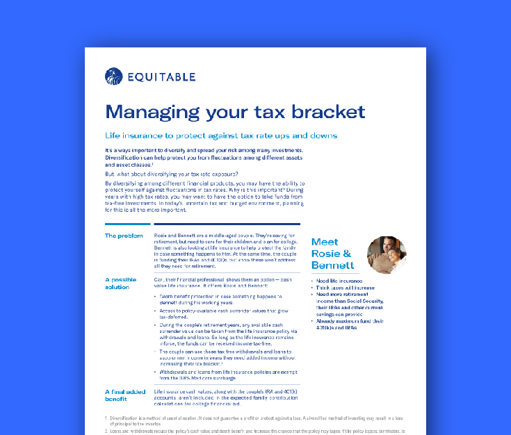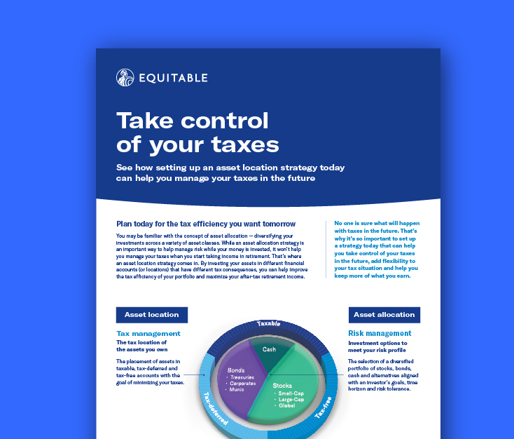 Building equity for retirement is important. When doing this, the accounts used can either be taxable, tax-deferred or tax-free. Equitable Advantage Maxsm can be that third category — tax-free. By using an asset location strategy with Equitable Advantage Maxsm, you can help your clients have more control over their taxes when it’s needed most.