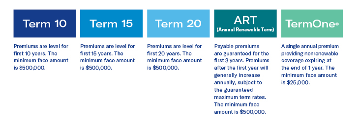 Our Term Series is basic life insurance for which your clients will pay level premiums for a specific period of time – 1, 10, 15 or 20 years – or they’ll pay premiums that are renewable and will increase each year as they get older. It pays a guaranteed death benefit to your clients’ beneficiaries that is generally income-tax-free, if they should die during that time period.
