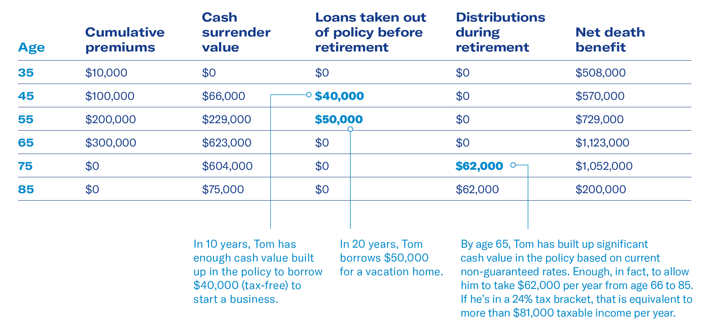 - Tom is able to borrow money to help start a business, and still have additional funds to supplement his retirement income from age 65 to 85.